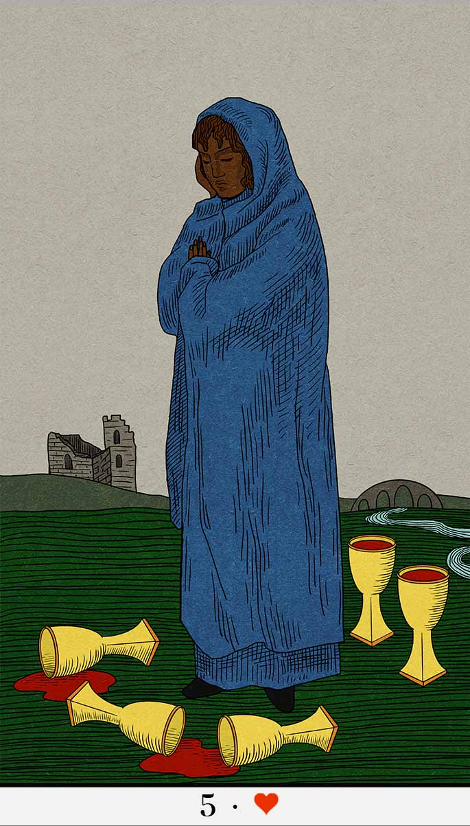 The “Five of Cups” card evokes an atmosphere of disappointment and sadness. It’s as if the person depicted is immersed in their own grief, unable to see the opportunities that are still available. It symbolizes the feeling of loss and regret, but also the need to confront negative emotions head-on in order to move forward.