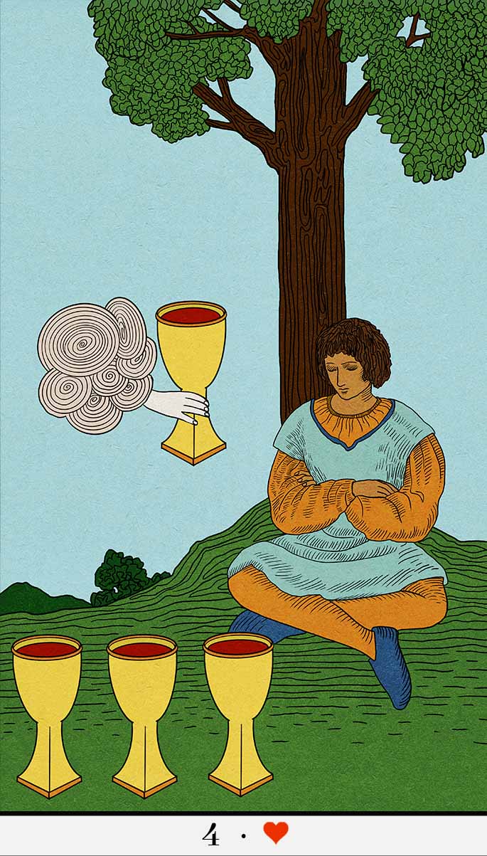 The “Four of Cups” symbolizes the need for contemplation and self-assessment. It typically indicates that the person is going through a period of stagnation or discontent in their life. They may be feeling bored with the monotony of their routine and seeking something more meaningful.